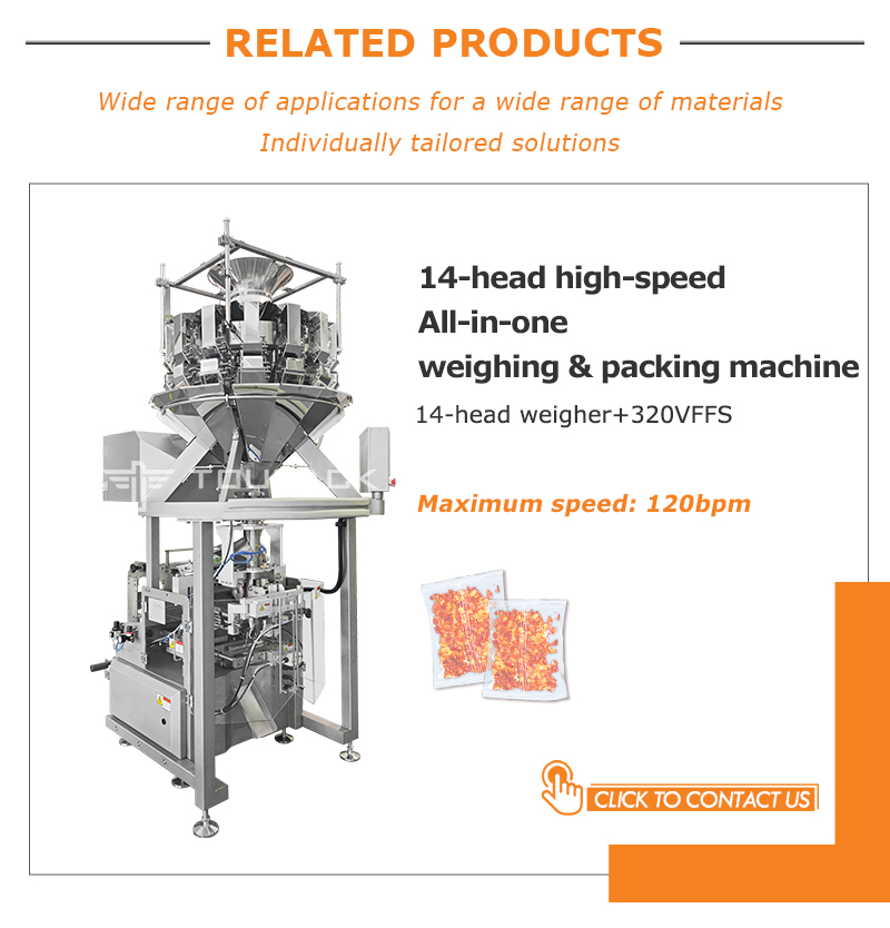 The fully automated packaging production line has the characteristic of high automation, which can achieve fast and accurate packaging of products. It usually includes conveying devices, weighing devices, packaging devices, etc., which can adapt to the packaging needs of different products, such as puffed food, snack food, pet food, frozen food, etc